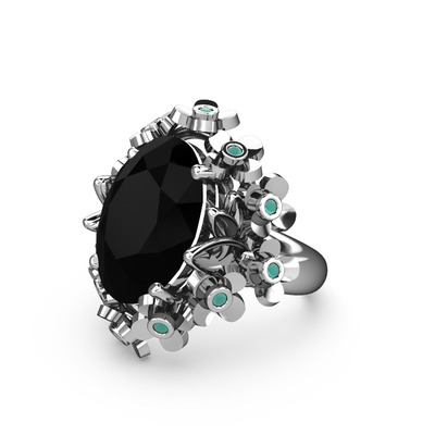 Siyah zirkon ve kök zümrüt 14 ayar beyaz altın yüzük
