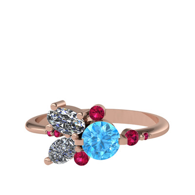 Akuamarin, beyaz zirkon ve rodolit garnet 8 ayar rose altın yüzük