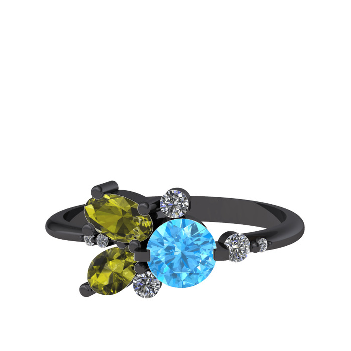 Akuamarin, peridot ve beyaz zirkon 925 ayar siyah rodyum kaplama gümüş yüzük