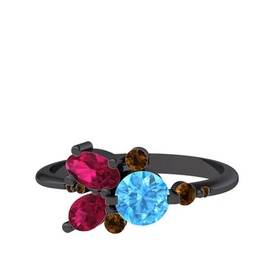 Akuamarin, rodolit garnet ve dumanlı kuvars 925 ayar siyah rodyum kaplama gümüş yüzük