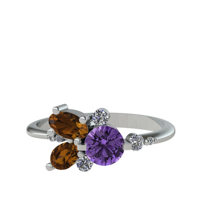 Ametist, dumanlı kuvars ve beyaz zirkon 8 ayar beyaz altın yüzük