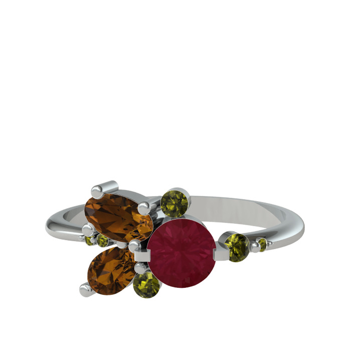 Kök yakut, dumanlı kuvars ve peridot 8 ayar beyaz altın yüzük