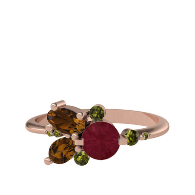 Kök yakut, dumanlı kuvars ve peridot 8 ayar rose altın yüzük