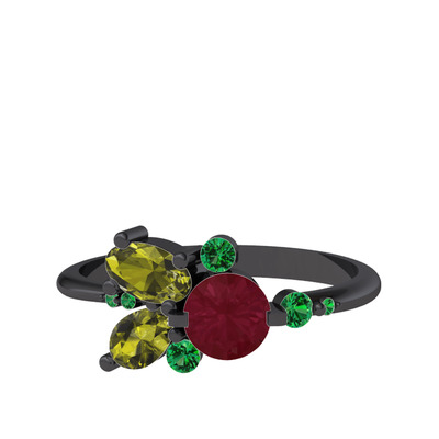Kök yakut, peridot ve yeşil kuvars 925 ayar siyah rodyum kaplama gümüş yüzük