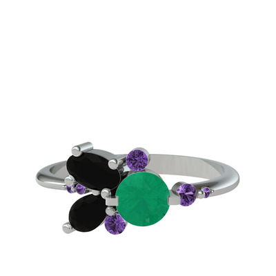 Kök zümrüt, siyah zirkon ve ametist 14 ayar beyaz altın yüzük