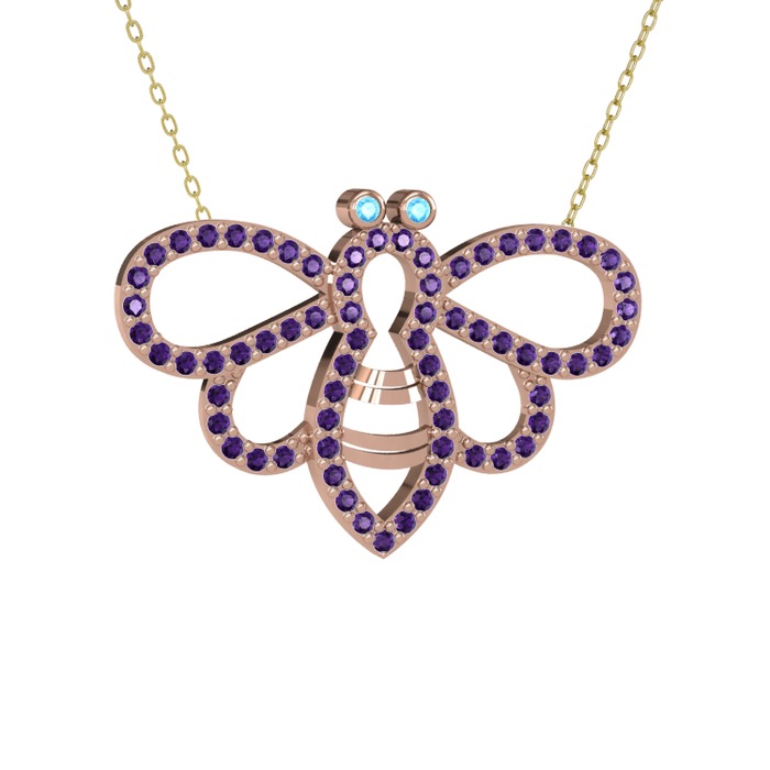 Akuamarin ve ametist 8 ayar rose altın kolye (40 cm altın rolo zincir)