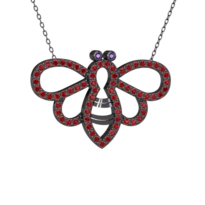 Ametist ve garnet 925 ayar siyah rodyum kaplama gümüş kolye (40 cm gümüş rolo zincir)