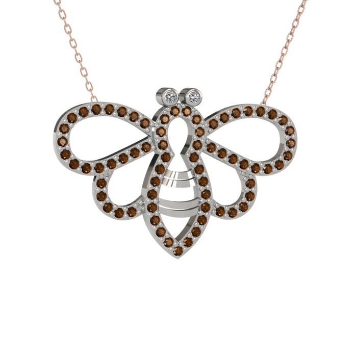 Beyaz zirkon ve dumanlı kuvars 18 ayar beyaz altın kolye (40 cm rose altın rolo zincir)