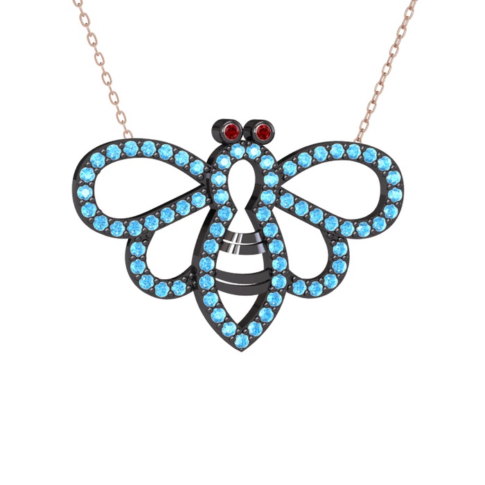 Garnet ve akuamarin 925 ayar siyah rodyum kaplama gümüş kolye (40 cm rose altın rolo zincir)