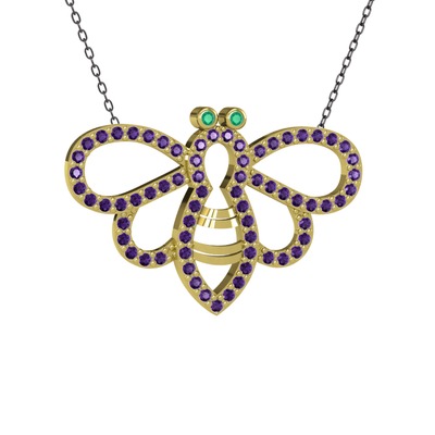 Kök zümrüt ve ametist 14 ayar altın kolye (40 cm gümüş rolo zincir)