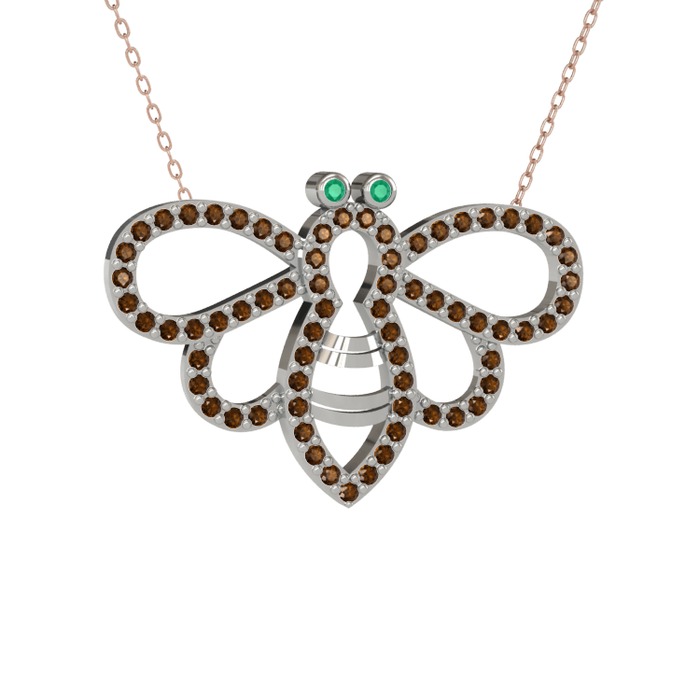 Kök zümrüt ve dumanlı kuvars 18 ayar beyaz altın kolye (40 cm rose altın rolo zincir)