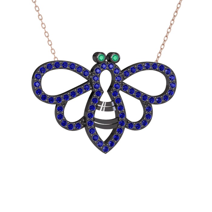 Kök zümrüt ve lab safir 925 ayar siyah rodyum kaplama gümüş kolye (40 cm rose altın rolo zincir)