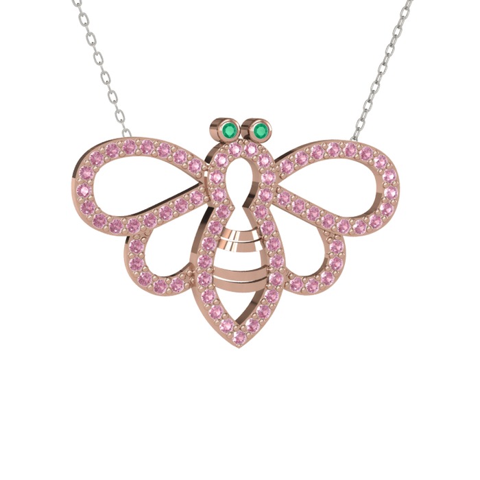 Kök zümrüt ve pembe kuvars 925 ayar rose altın kaplama gümüş kolye (40 cm gümüş rolo zincir)