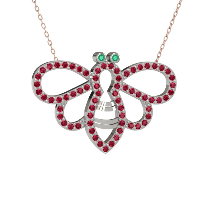 Kök zümrüt ve rodolit garnet 8 ayar beyaz altın kolye (40 cm rose altın rolo zincir)