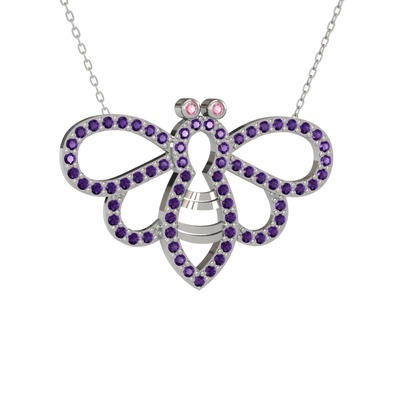 Pembe kuvars ve ametist 18 ayar beyaz altın kolye (40 cm beyaz altın rolo zincir)