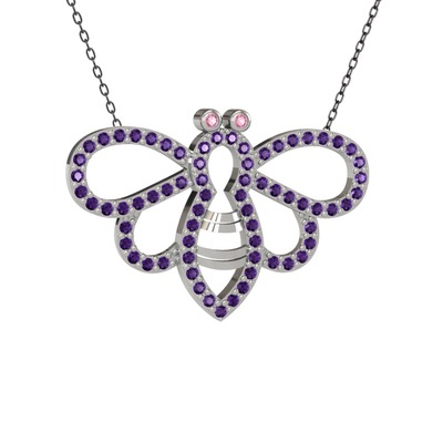 Pembe kuvars ve ametist 18 ayar beyaz altın kolye (40 cm gümüş rolo zincir)