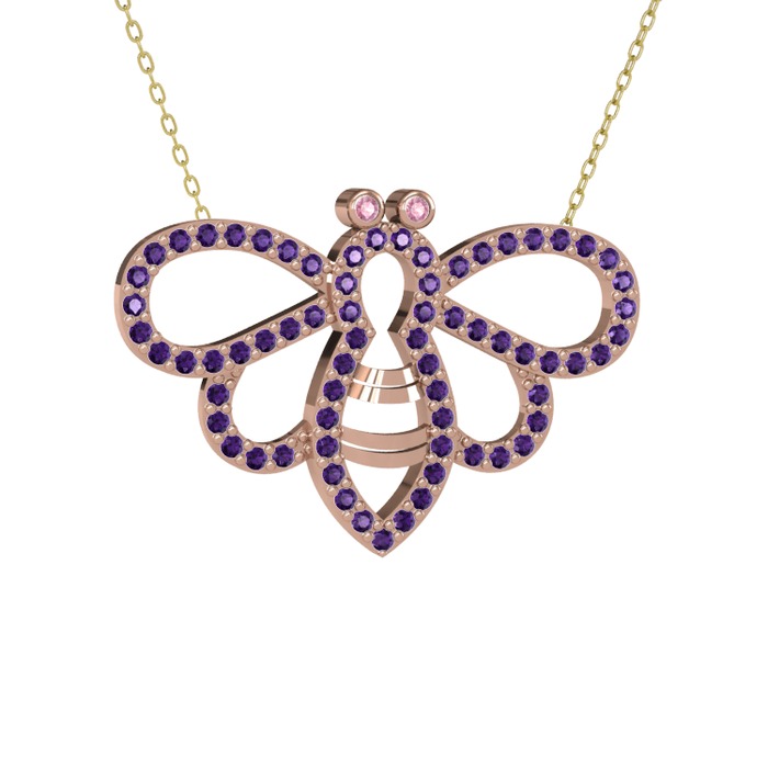 Pembe kuvars ve ametist 8 ayar rose altın kolye (40 cm altın rolo zincir)