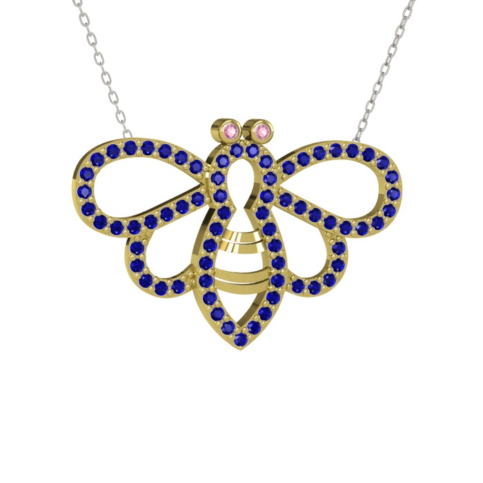 Pembe kuvars ve lab safir 18 ayar altın kolye (40 cm gümüş rolo zincir)