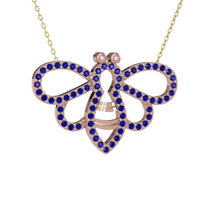 Pembe kuvars ve lab safir 8 ayar rose altın kolye (40 cm altın rolo zincir)