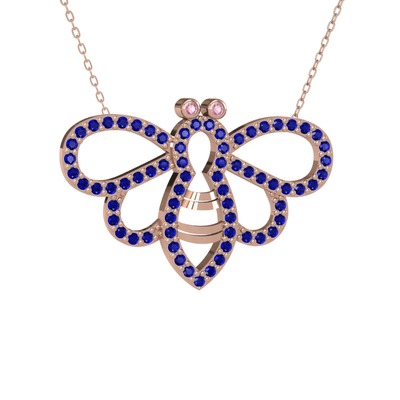 Pembe kuvars ve lab safir 8 ayar rose altın kolye (40 cm gümüş rolo zincir)