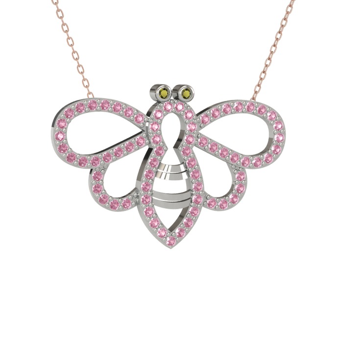 Peridot ve pembe kuvars 18 ayar beyaz altın kolye (40 cm rose altın rolo zincir)