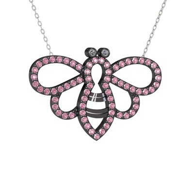 Pırlanta ve pembe kuvars 925 ayar siyah rodyum kaplama gümüş kolye (0.022 karat, 40 cm beyaz altın rolo zincir)