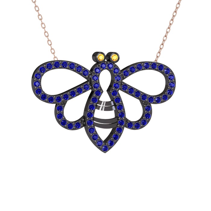 Sitrin ve lab safir 925 ayar siyah rodyum kaplama gümüş kolye (40 cm rose altın rolo zincir)