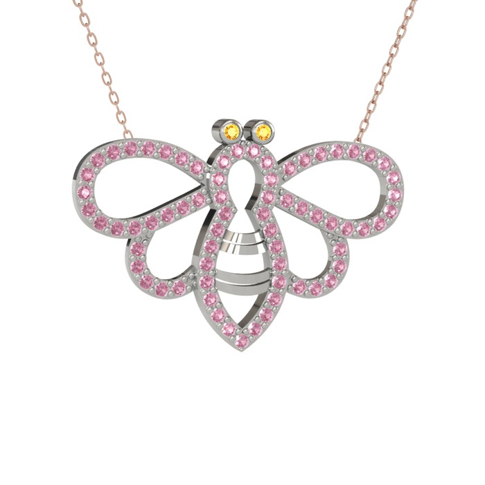 Sitrin ve pembe kuvars 18 ayar beyaz altın kolye (40 cm rose altın rolo zincir)