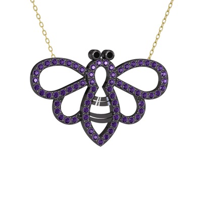 Siyah zirkon ve ametist 925 ayar siyah rodyum kaplama gümüş kolye (40 cm altın rolo zincir)