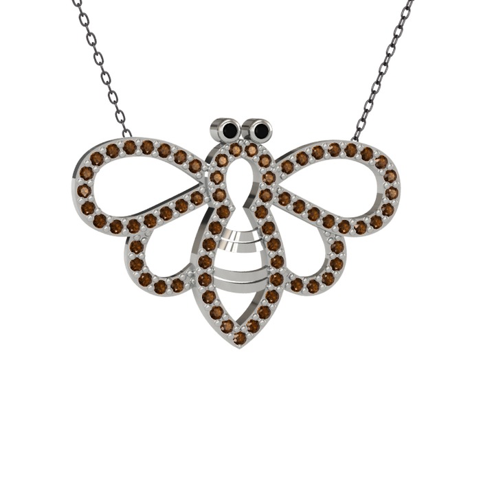 Siyah zirkon ve dumanlı kuvars 14 ayar beyaz altın kolye (40 cm gümüş rolo zincir)