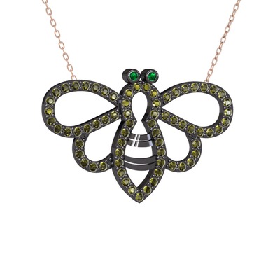 Yeşil kuvars ve peridot 925 ayar siyah rodyum kaplama gümüş kolye (40 cm rose altın rolo zincir)