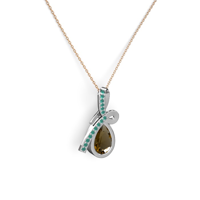 Kök zümrüt ve dumanlı kuvars 14 ayar beyaz altın kolye (40 cm rose altın rolo zincir)