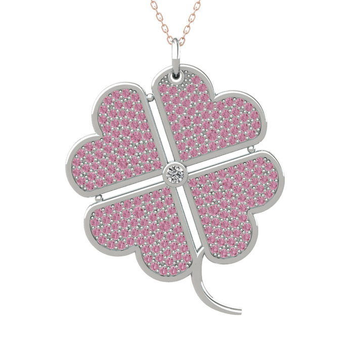 Beyaz zirkon ve pembe kuvars 18 ayar beyaz altın kolye (40 cm gümüş rolo zincir)