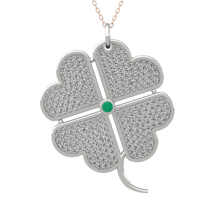 Kök zümrüt ve beyaz zirkon 18 ayar beyaz altın kolye (40 cm rose altın rolo zincir)
