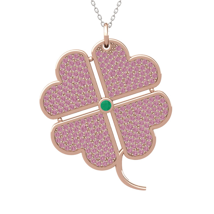 Kök zümrüt ve pembe kuvars 18 ayar rose altın kolye (40 cm beyaz altın rolo zincir)