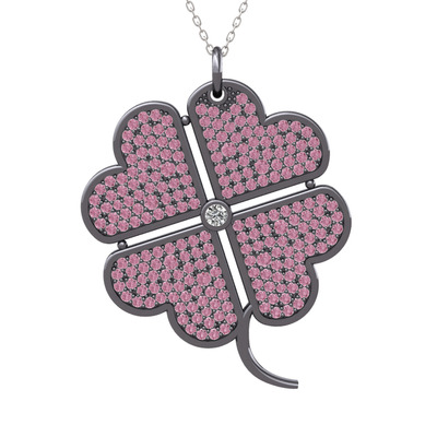 Pırlanta ve pembe kuvars 925 ayar siyah rodyum kaplama gümüş kolye (0.11 karat, 40 cm beyaz altın rolo zincir)