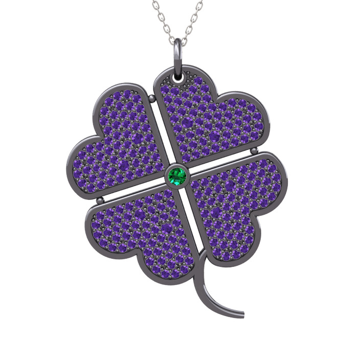 Yeşil kuvars ve ametist 925 ayar siyah rodyum kaplama gümüş kolye (40 cm beyaz altın rolo zincir)