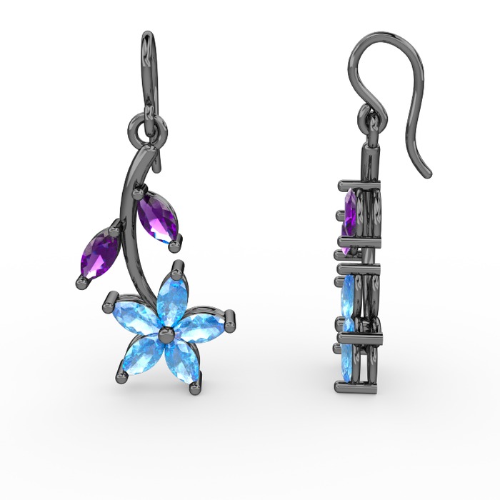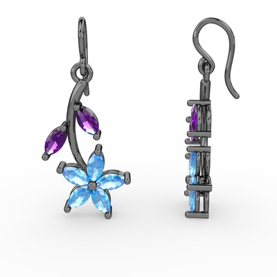 Akuamarin ve ametist 925 ayar siyah rodyum kaplama gümüş küpe