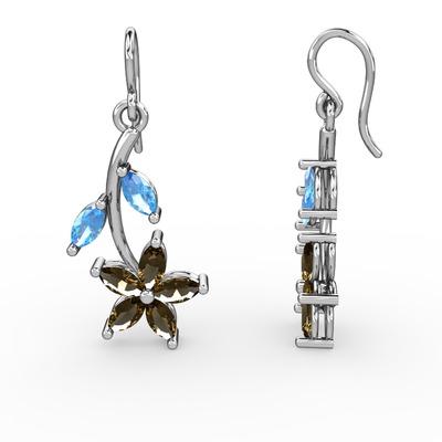 Dumanlı kuvars ve akuamarin 8 ayar beyaz altın küpe