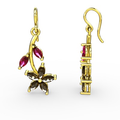 Dumanlı kuvars ve rodolit garnet 18 ayar altın küpe