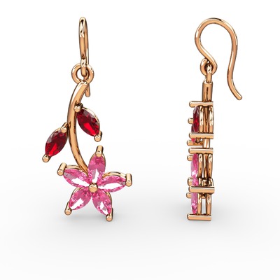 Pembe kuvars ve garnet 14 ayar rose altın küpe