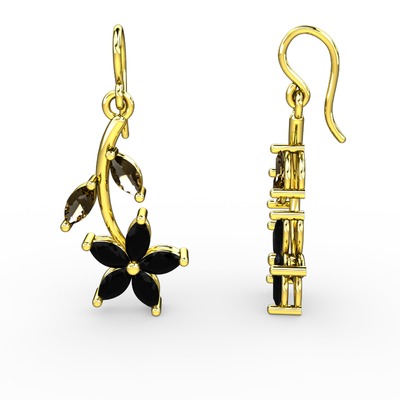 Siyah zirkon ve dumanlı kuvars 14 ayar altın küpe