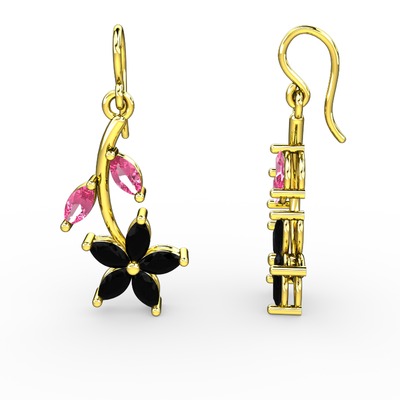 Siyah zirkon ve pembe kuvars 18 ayar altın küpe
