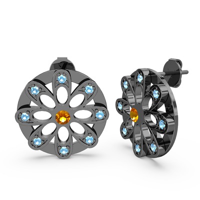 Akuamarin ve sitrin 925 ayar siyah rodyum kaplama gümüş küpe
