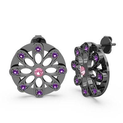Ametist ve pembe kuvars 925 ayar siyah rodyum kaplama gümüş küpe