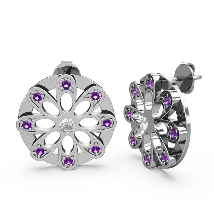 Ametist ve pırlanta 18 ayar beyaz altın küpe (0.12 karat)