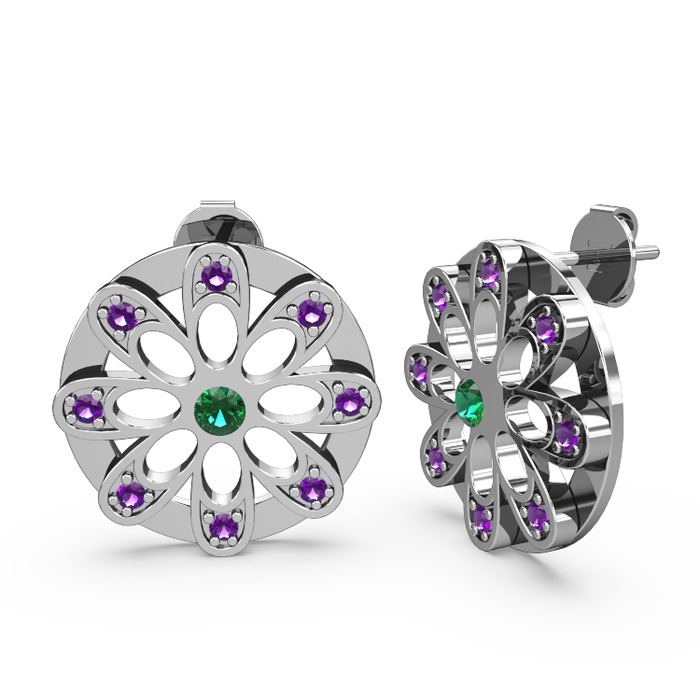 Ametist ve yeşil kuvars 8 ayar beyaz altın küpe