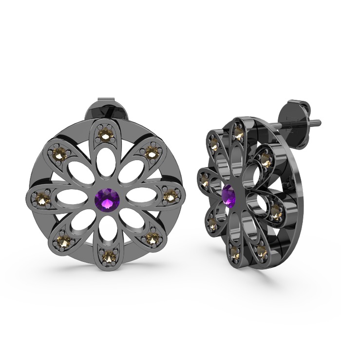 Dumanlı kuvars ve ametist 925 ayar siyah rodyum kaplama gümüş küpe