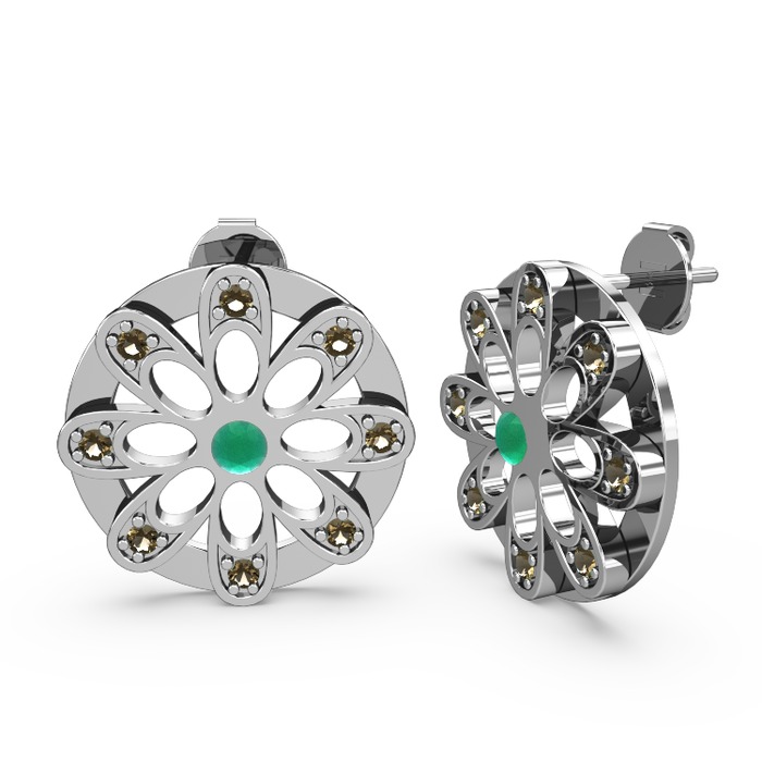 Dumanlı kuvars ve kök zümrüt 18 ayar beyaz altın küpe