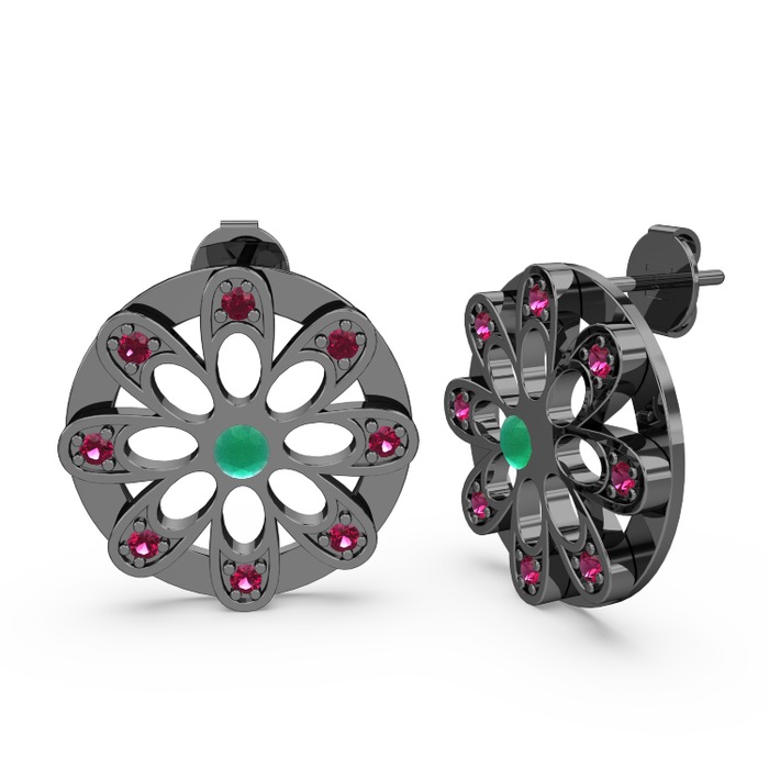 Rodolit garnet ve kök zümrüt 925 ayar siyah rodyum kaplama gümüş küpe